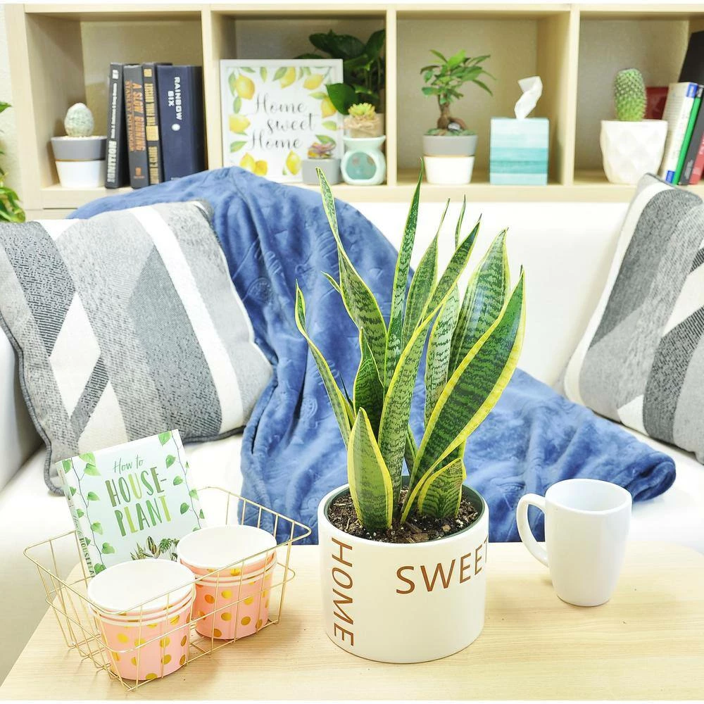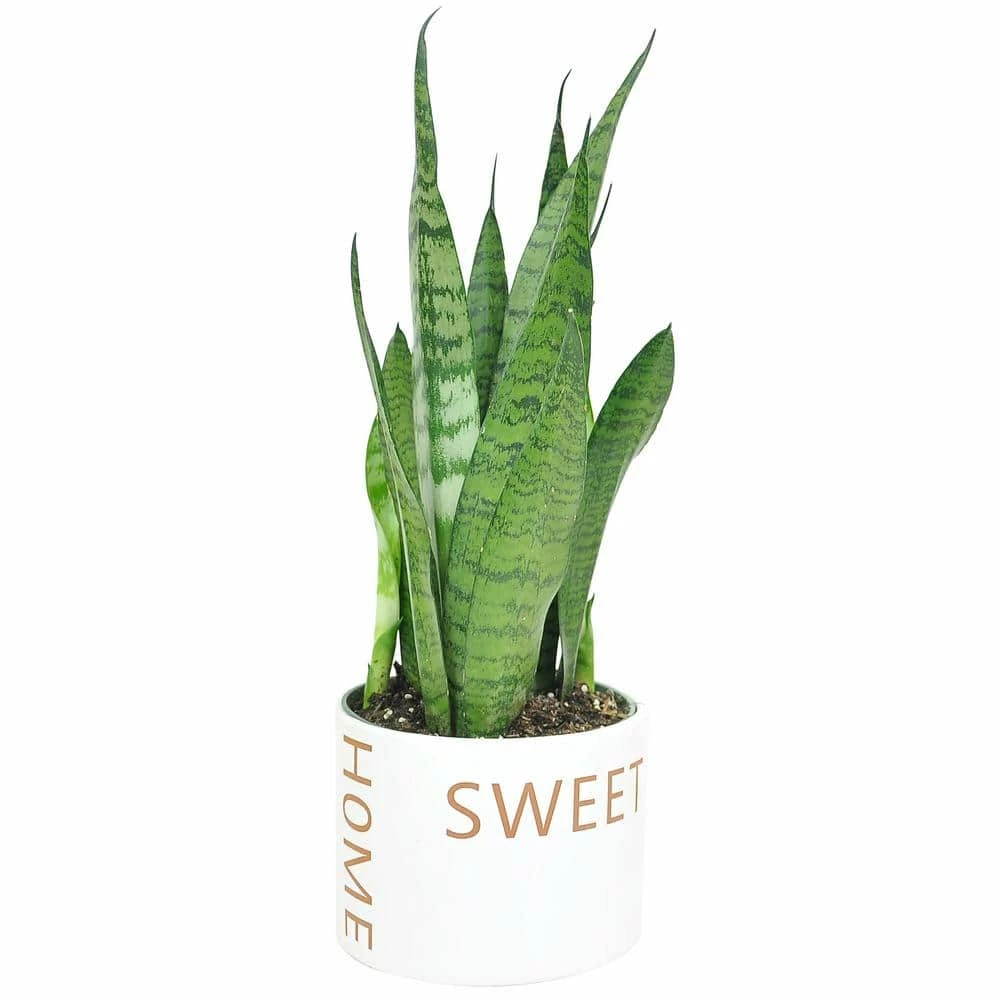 The Snake Plant features stiff, upright, sword-like leaves banded or edged in gray, silver, or gold and adds life to a brightly lit room at home, a lightly shaded porch, or in the office. It grows best near a sunny window. Water when the top couple inches of the soil are dry (about once a week) and be sure all excess water drains away. If the container does not have holes, use approximately 2-3 cups of water, adjust as needed for your environment. Do not let the Snake Plant sit in water or overly soggy soil. This hardy indoor plant is very adaptable to a wide range of growing conditions.