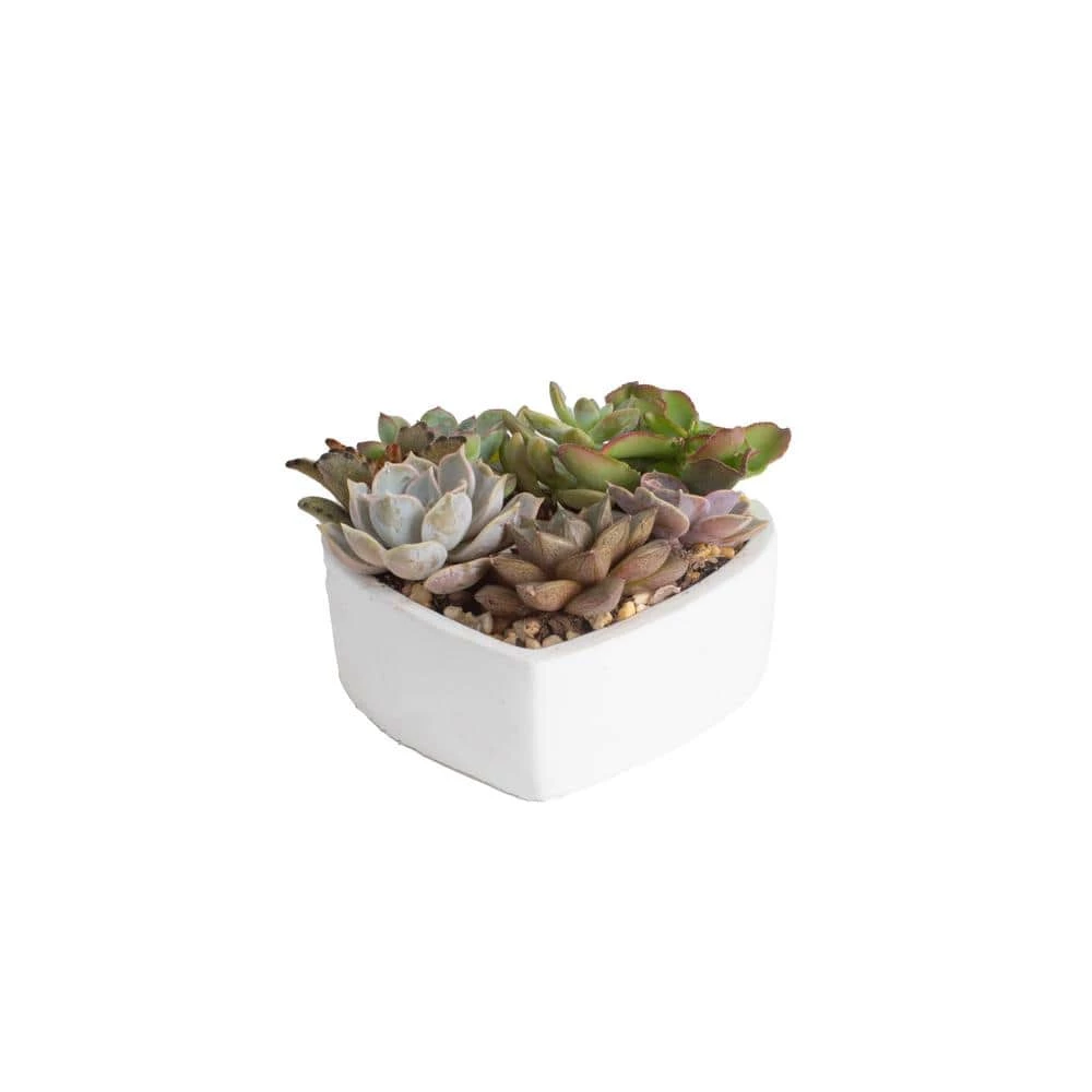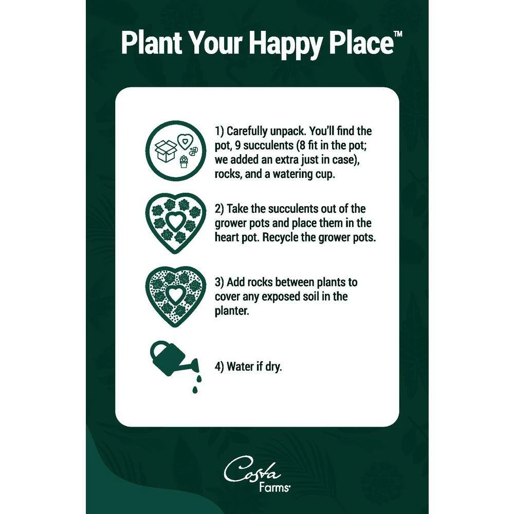 Create your own succulent garden. Decorate your home or office with the beauty of an easy-care succulent garden. Included will be a 6 in. Heart Ceramic, (9) mini 2 in. succulents, rocks and a watering cup. Use your creativity and add a colorful touch to your decor.
