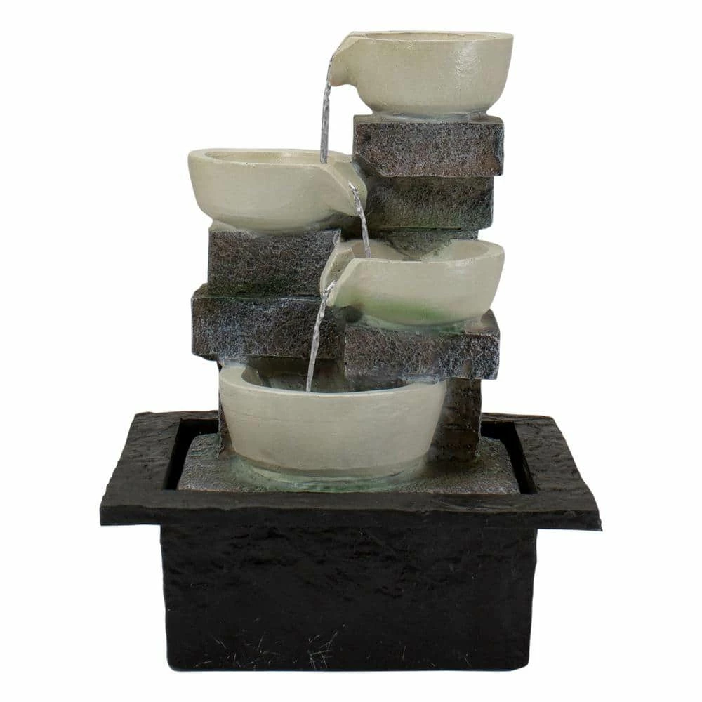 This cascading fountain provides a tranquil and soothing addition to your indoor living areas. It comes illuminated by a white LED light and features 4 tiered bowls creating a modern look. Relax to the sounds of the soft natural water flow as it trickles down through the fountain. Product features: Self-sustaining fountain. Cascading 4-tiered bowls. Water flows from bowl to bowl to the bottom well. Constantly recycles the same water. Bottom bowl is illuminated by a white LED light. Constructed from durable polystone with a modern design. Some assembly required. Additional Product Features: 12-Volt 60 hertz 2 watt submersible pump. AC adapter input: 120-Volt 60 hertz 0.28 Amps watts. AC adapter output: 12-Volts 0.3 Amps. Class 2 power supply. UL certified and approved for indoor use only. Dimensions: 11 in. H x 8.25 in. L x 7.5 in. W. Material(s): polystone/plastic.