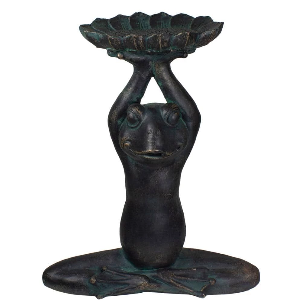 Sitting peacefully in meditation this yoga frog statue adds a calming decorative vibe to your outdoor decor. Stretching up tall as can be to feed the birds he is a welcome sight to your feathered friends. Whether this guy goes in your garden sits on your porch or in your yard he is a trendy addition to your home. Features: Frog with bird feeder outdoor statue. Frog is sitting cross-legged. Front arms are stretched up tall holding a bird feeder. He has a cute frog face. Bird feeder has a diamond-shaped edge. Crafted from magnesium oxide ceramic for years of enjoyment. Dimensions: 22.25 in. H x 18.5 in. W x 7.25 in. D. Material(s): MgO ceramic.